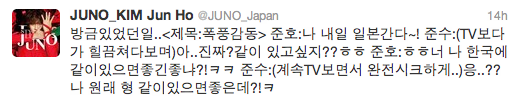 (Title: Lágrimas) Junho:(listo para partir) Hyung-nim esta dejándote~!!keke Junsu:(acostado en la cama) Ung! Good~bye~~!! Junho: Yah! no vas a salir y despedir a tu hyung-nim off!!ke Junsu:
