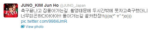 El partido de fútbol finalizó y viajando a casa.. Debido a la filmación fui capaz de solo dormir 2 horas asi que después del jugar al fútbol estoy muy cansadooo!! Una selca mientras viajo a casa o(*゚▽゚*)o))) (N/T: Puedes ver a Junsu al fondo?)