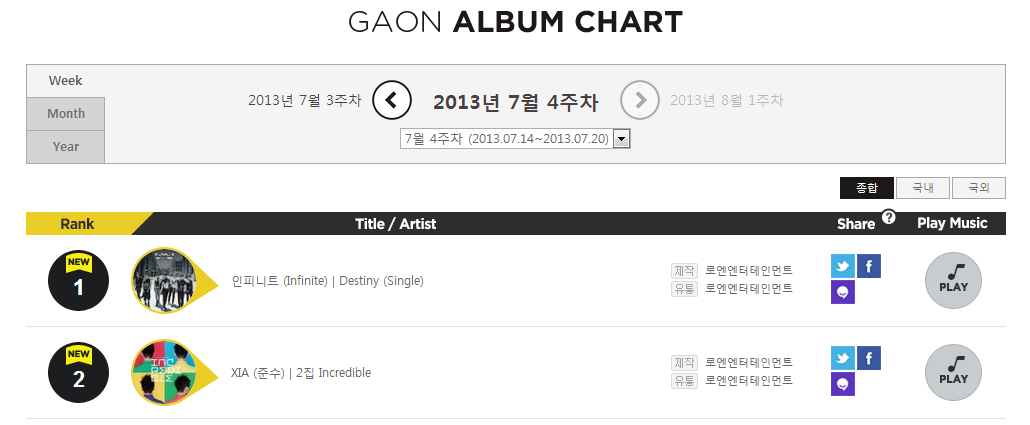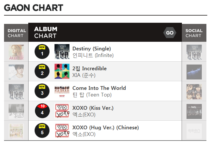 El Gaon Chart es el gráfico nacional de Corea del Sur y seria el equivalente del Oricon en Japón y Billboard en los Estados Unidos.1. INFINITE – ‘Destiny’